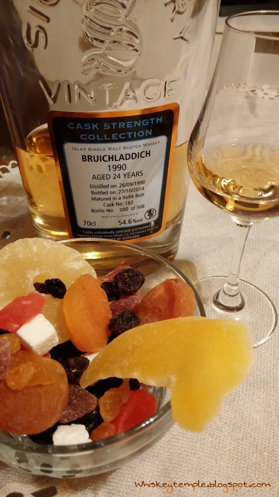 Течността е дестилирана на 26.09.1990г. именно в тази дестилерия и е бутилирана на 27.10.2014г. И ако началото на живота `и е поставено в медните казани на Брухлади, то финалният етап – отлежаването и бутилирането, е осъществен другаде. Напитката е бутилирана от компанията Signatory, която представлява фирма-независим бутилировач на уиски. След производството на алкохола тя е закупила неизвестен за нас брой бъчви от дестилерията /а и не само от тази/ и ги е транспортирала до свой склад, където в правилния момент е решила, че уискито е готово да бъде бутилирано, означавайки произхода му. В общи линии, до това се свежда дейността на компаниите като Сигнътъри – купуват току-що произведен спирт, или младо уиски, съхраняват го и след време го бутилират от свое име и за своя сметка.