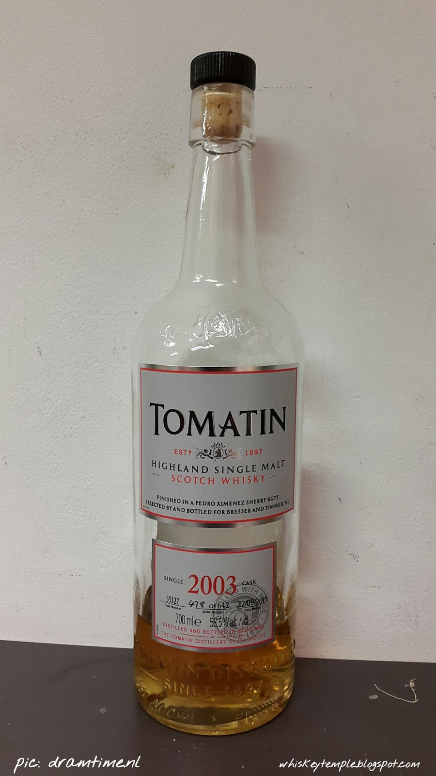 Вече няколко години подред следя изкъсо какво количство алкохол консумирам в новогодишната нощ. Не виждам смисъл в наливането до безкрай – ясно ви е защо. Организмът ни, колкото и да изглежда непобедим, може да бъде повлиян негативно в дългосрочен план от повечкото изпити алкохолни течности. Заради това се опитвам да спазвам поведение на умерена консумация, което позволява в деня след 31.12. да дегустирам уиски, без да се притеснявам от количеството спирт, преминал за ден през тялото ми. И ето че в първия ден на 2017-а година се срещнах отбилзо с 12-годишния Томатин, дестилиран през 2003г., пълнен само от една бъчва, без разреждане с вода, бутилиран специално за холандския вносител „Bresser & Timmer“, мостра от който закупих през лятото от хорандския сайт Драмтайм /dramtime/ – Tomatin vintage 2003, 12 y.o., single cask № 35327, PX cask finish, cask strength whisky .
