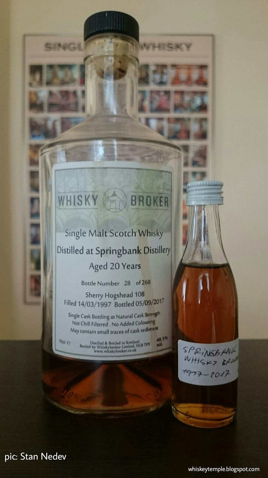 Днешната ни среща започна без словесна увертюра. Без излишно прахосничество на думи и време се представя и самата бутилка, мостра от която пристигна до мен благодарение на приятел /наздраве, Стан!/ – хартиеният къс демонстрира отлично познание на душата на истинския ценител на уискито като напитка. Кратко, точно и ясно, почти в телеграфски стил, са възпроизведени съществените белези на това 20-годишно малцово /ечемично/ уиски. Да, то произлиза от мощите на Спрингбанк, но бъчвата /в случая уискито е пълнено само от едно буре с № 108/ е била продадена на хората от сравнително новата компания „Уиски брокер“ /Whisky Broker/. Говорейки за самото дърво, не би било възможно да подминем и предишното съдържимо, което то е съхранявало преди дестилирания през 1997г. Спрингбанк – бурето е от типа шери хогсхед /sherry hogshead/, което ще рече, че летвите за него са били съчленени от няколко други ползвани преди това бъчви, а преди самото уиски в него е отлежавало испанското вино шери /съдейки от впечатленията си бих предположил, че шерито е било олоросо/. Общо са били бутилирани 268 бутилки, а моята доза произлиза от шише № 28. И тъй като говорим за делото на компания-независим бутилировач /основана през 2010г. от Мартин Армстронг/, която държи на коректното отношение, то можем спокойно да възхвалим естествения, почти махагонов цвят на уискито – карамел е150 не е добавян, а наподобяващата кола напитка не е била студено филтрирана. Откъде знам – пише го на етикета. По недвусмислен начин са отразени и датата на дестилиране на алкохола /14.03.1997г./ и на бутилирането му /05.09.2017г./, както пълненето му без добавяне на вода /cask strength/ при красивия алокохолен градус от 48,9%.